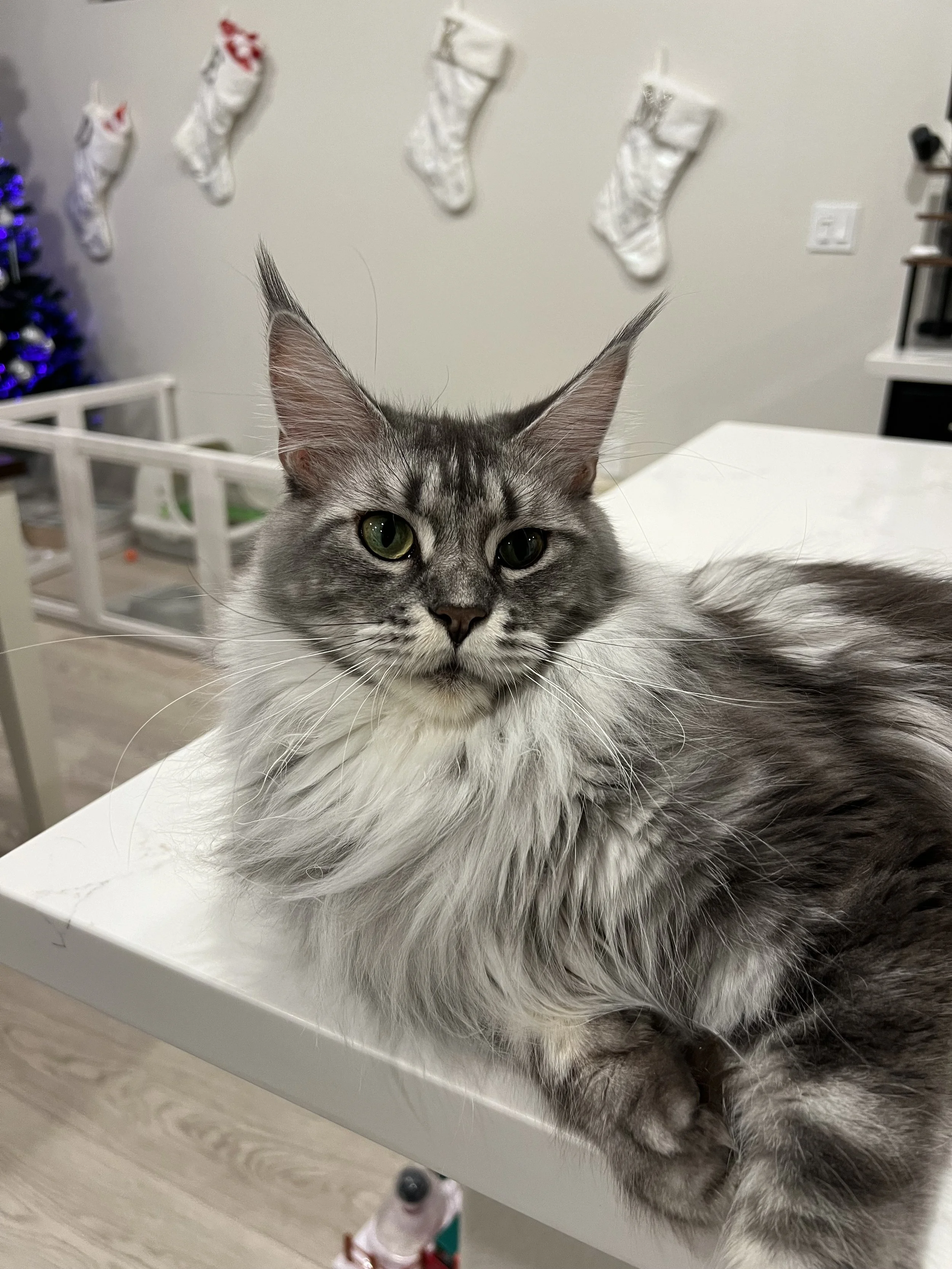 My name is Helmi! Sometimes I’m called Helmet for fun. I am a Black Silver Shaded Mackerel Tabby girl and I am 2 years old. I just recently came to Maine Coon Mayhem but I have already made myself at home like I’ve been here forever. I’m massive for a female Maine Coon in size and personality! If you hear a crash, it was probably me. If you don’t? I’m planning something.