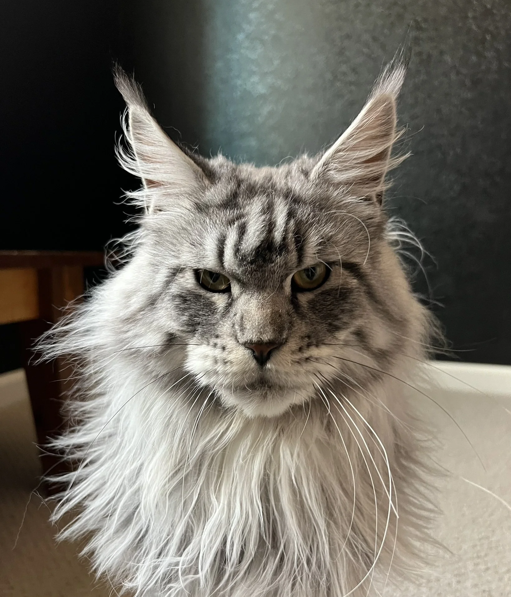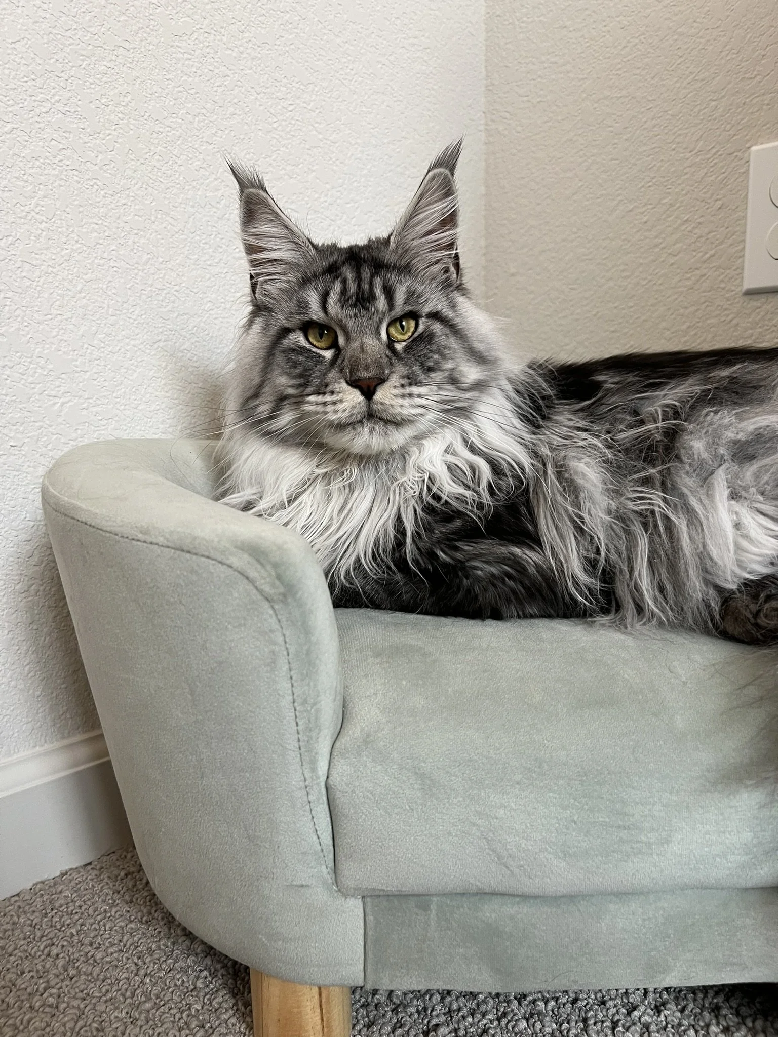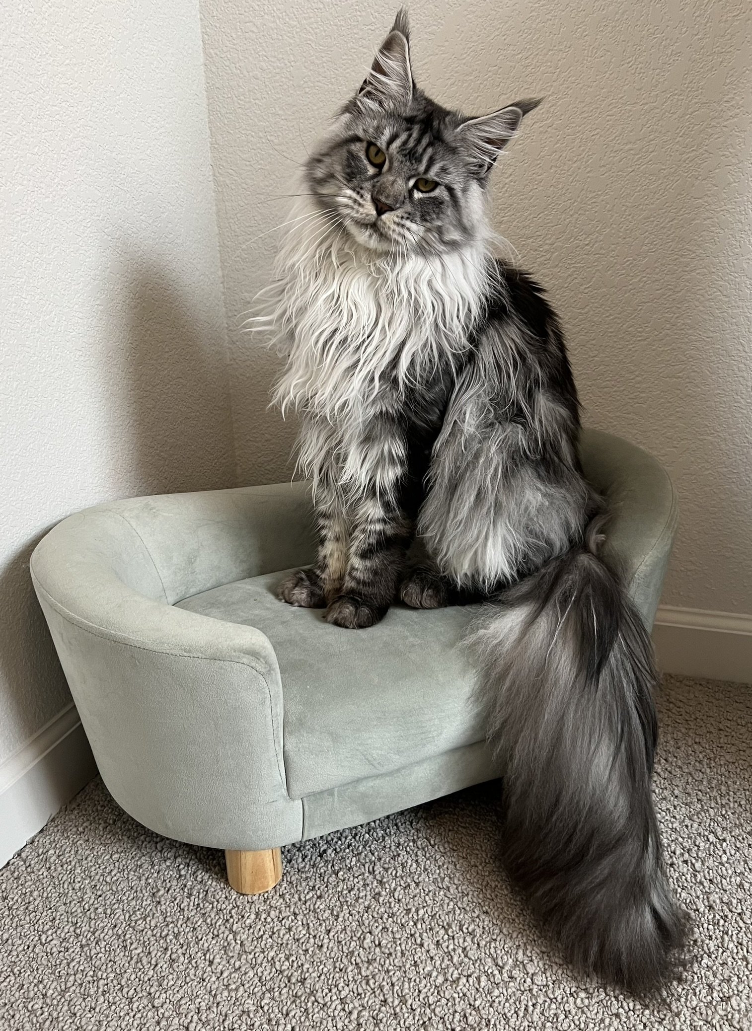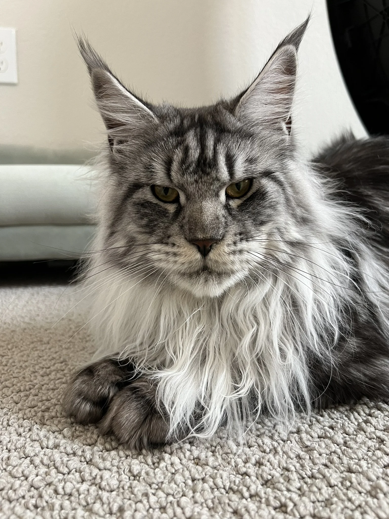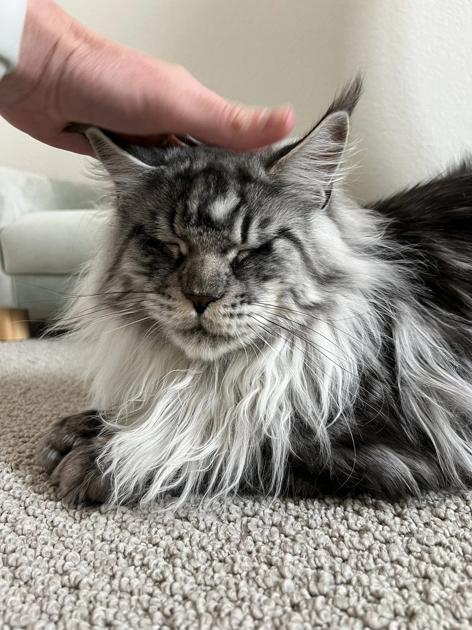 I am Nine! I am a black silver classic tabby. I am the sweetest boy you’ll ever meet. I LOVE to bonk people with my big fat head. I also love wandering down the hallway and howling as loud as I can. Some of my other favorites include peeing on walls, peeing on cat trees, peeing in water bowls, and peeing on the floor!