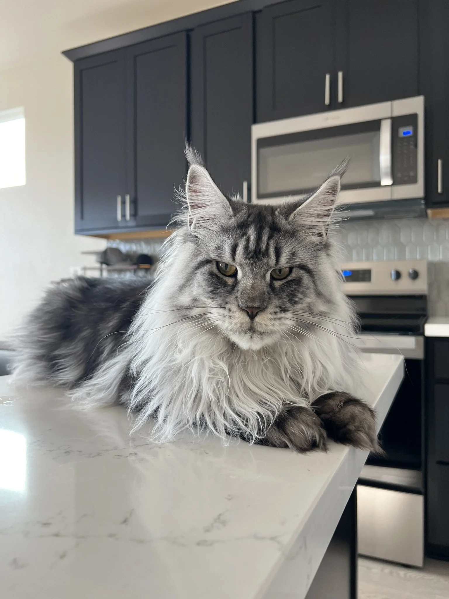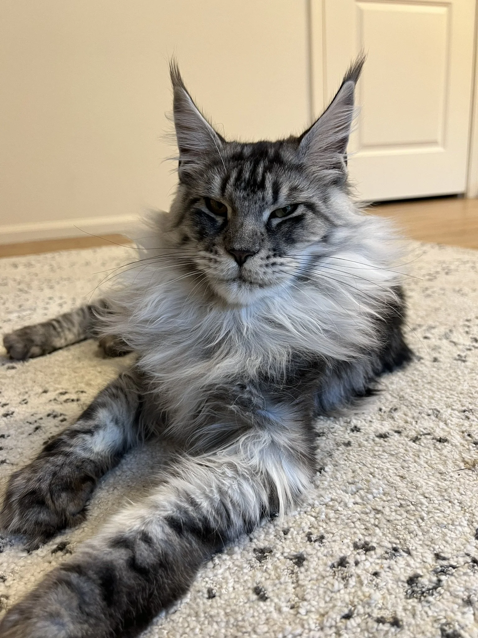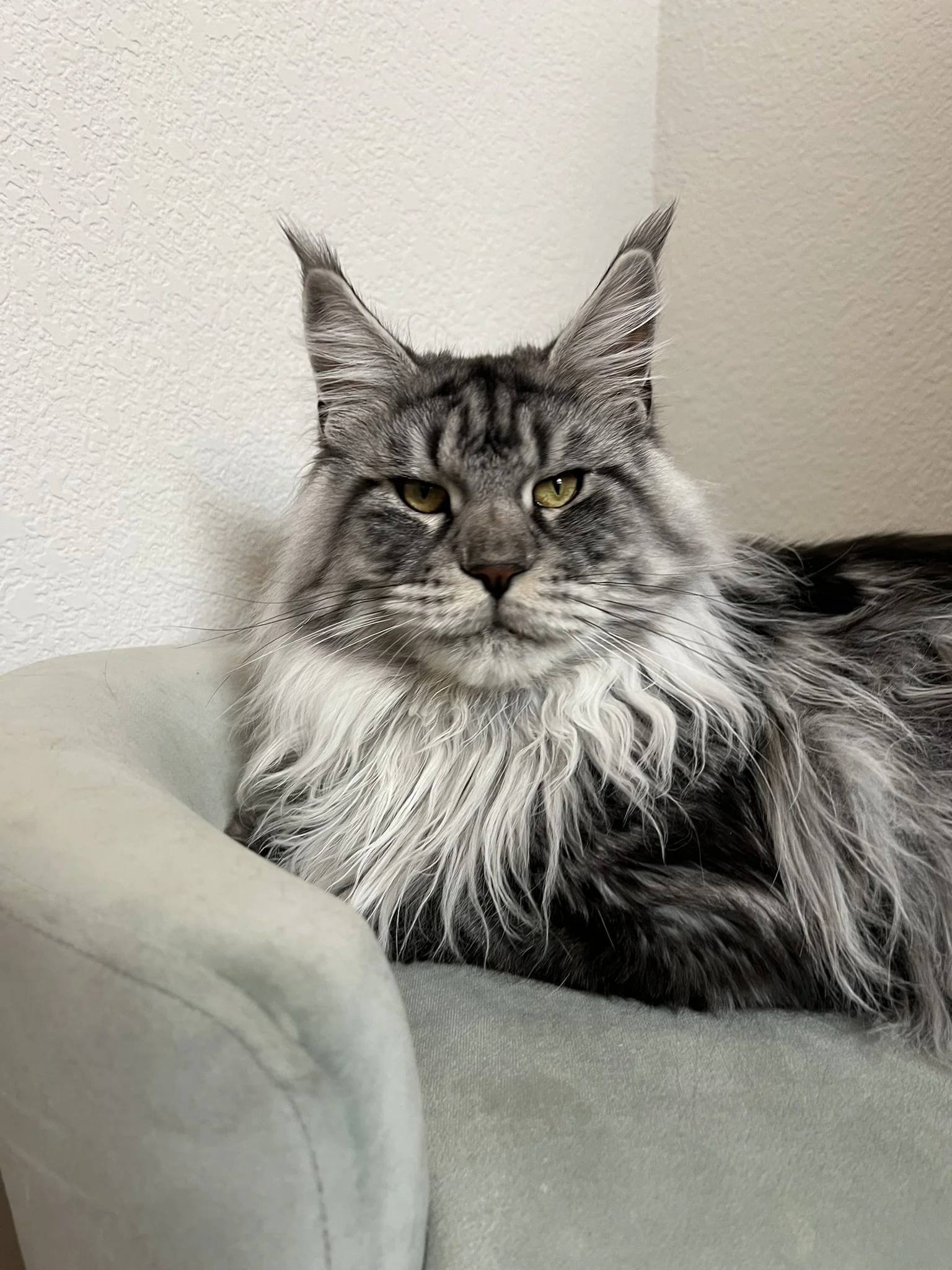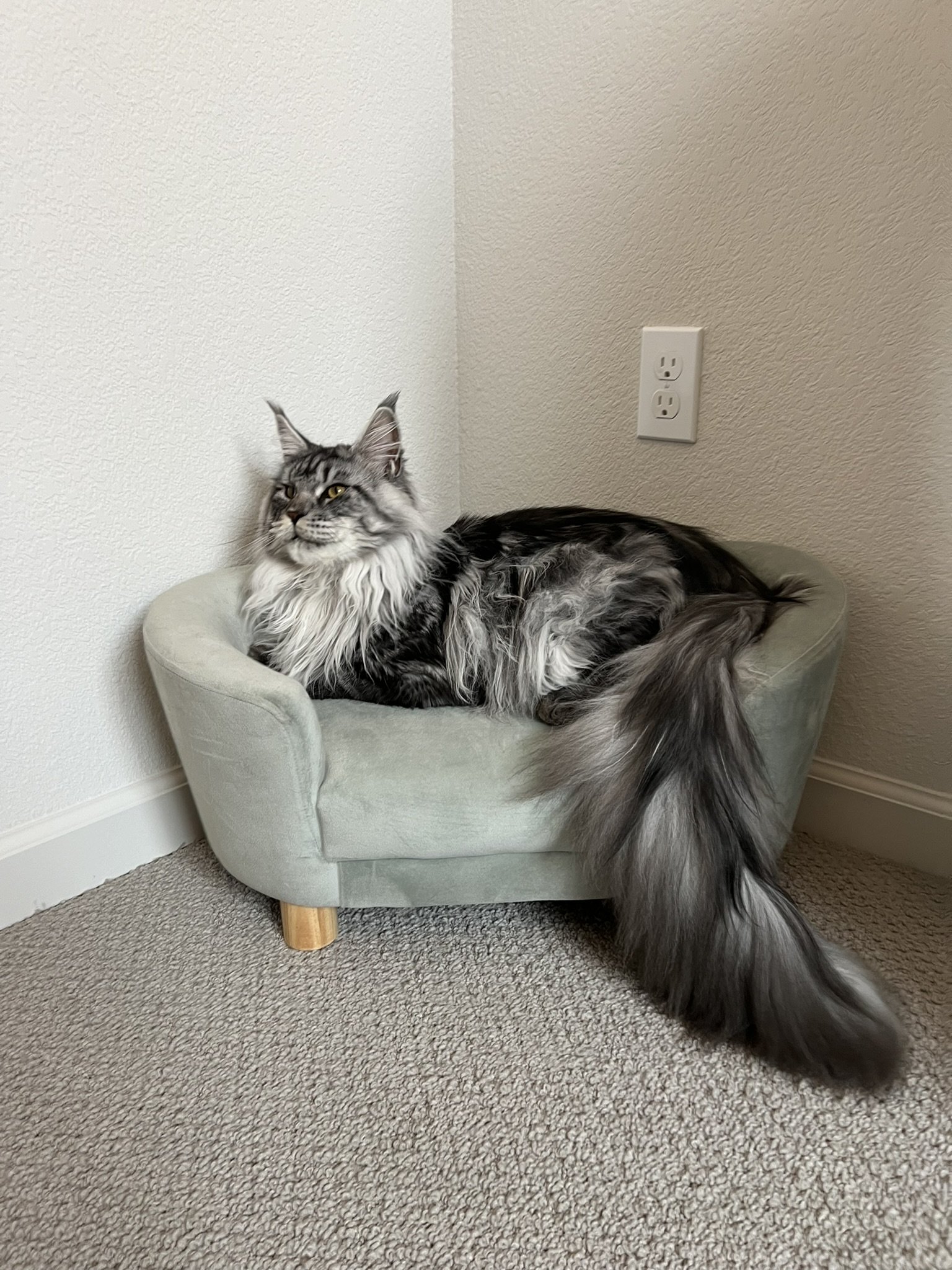 I am Nine! I am a black silver classic tabby. I am the sweetest boy you’ll ever meet. I LOVE to bonk people with my big fat head. I also love wandering down the hallway and howling as loud as I can. Some of my other favorites include peeing on walls, peeing on cat trees, peeing in water bowls, and peeing on the floor!